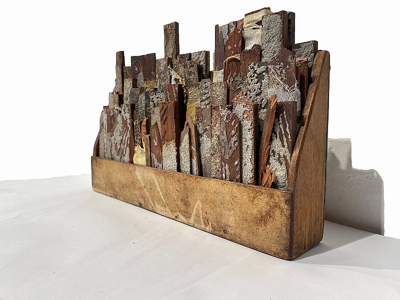 , Emma Willemse , Discarded parquet floor blocks, found wooden shelf, scrim