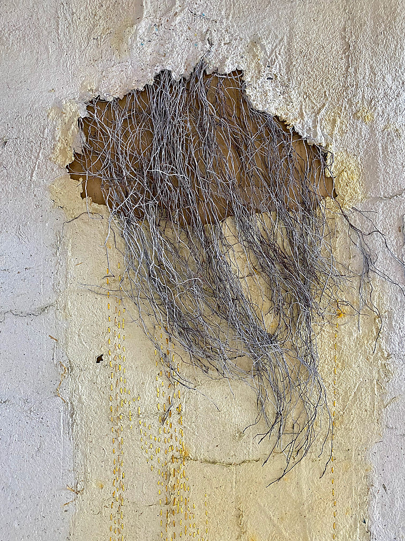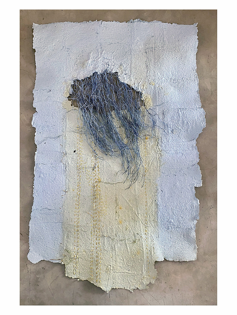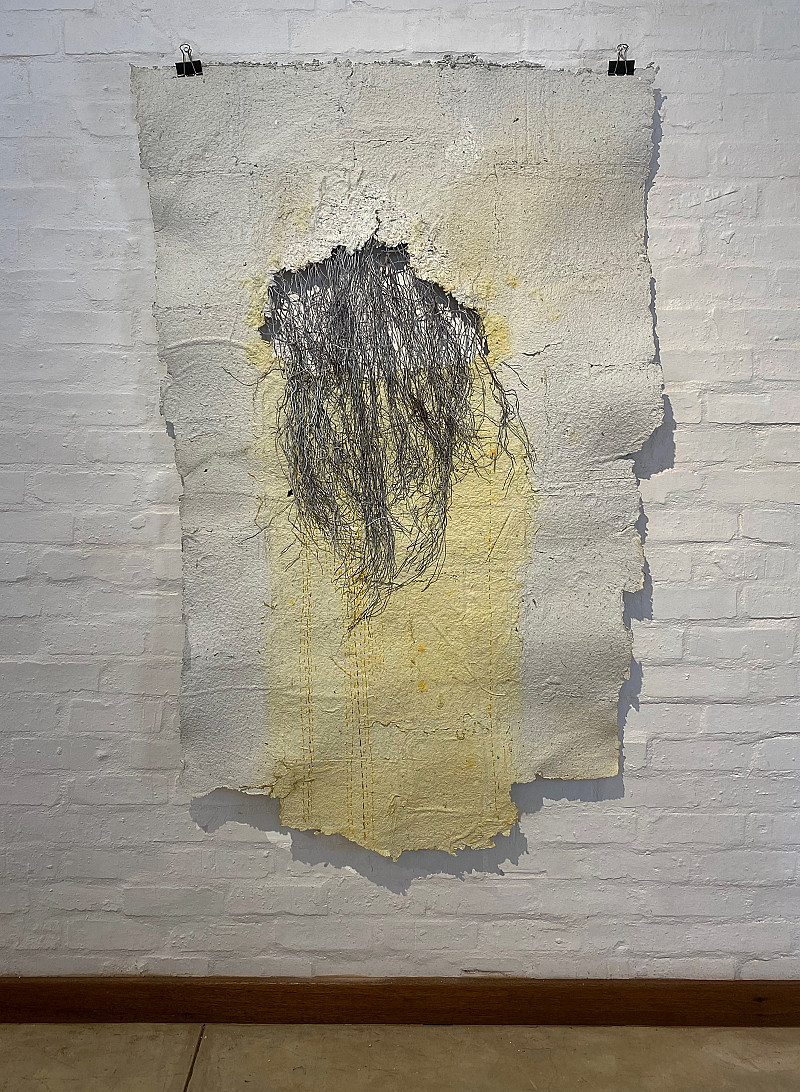 , , Paper pulp collage, cotton stitching and air roots from a Ficus tree