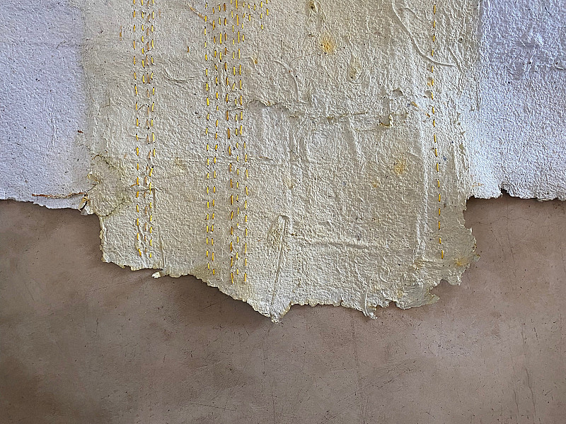 Paper pulp collage, cotton stitching and air roots from a Ficus tree